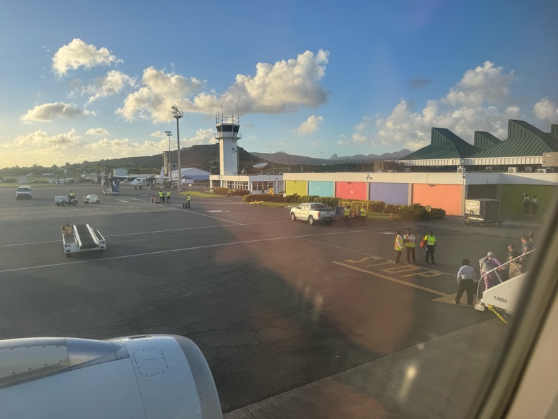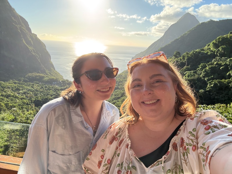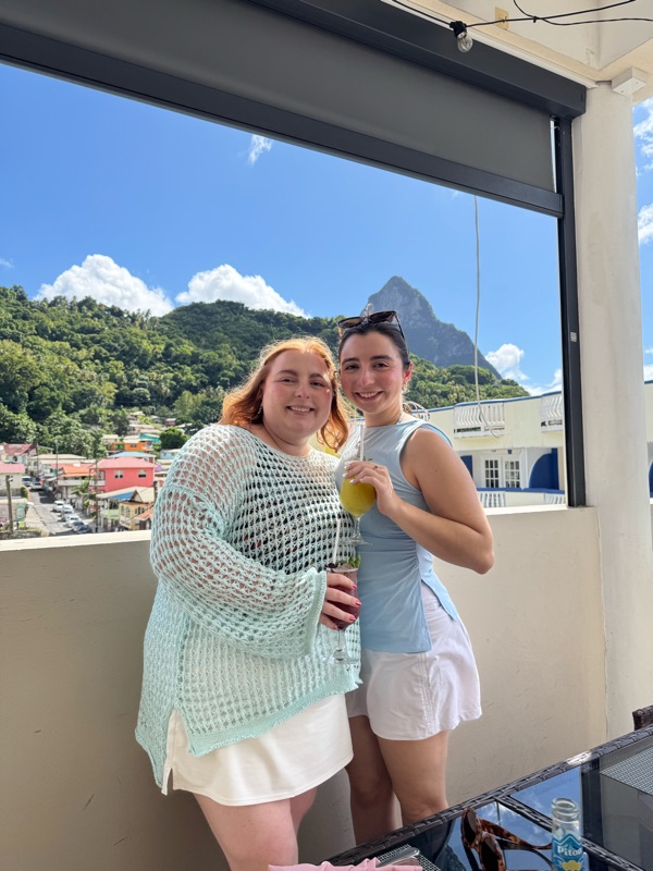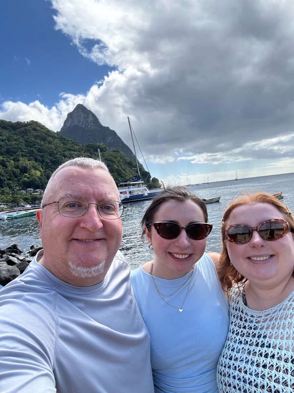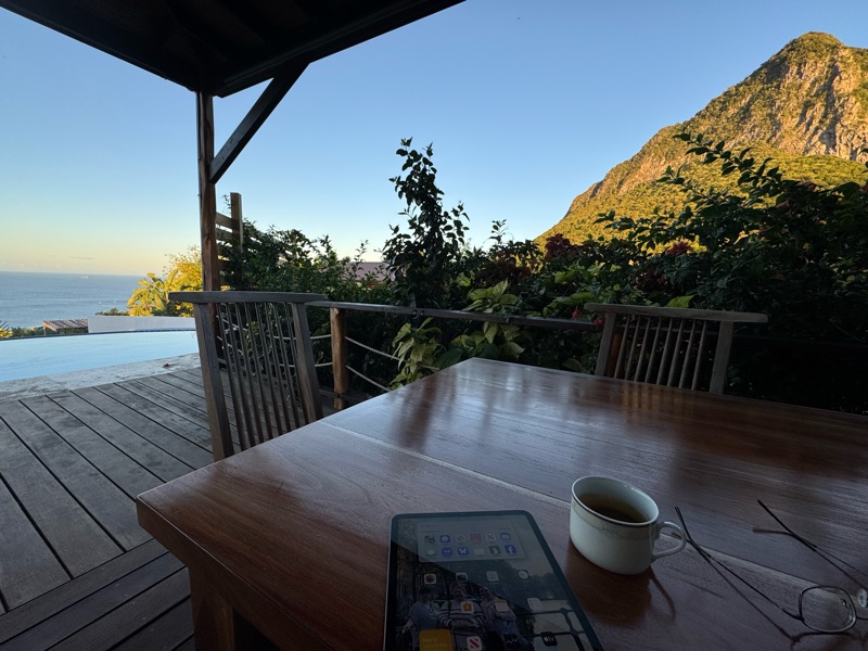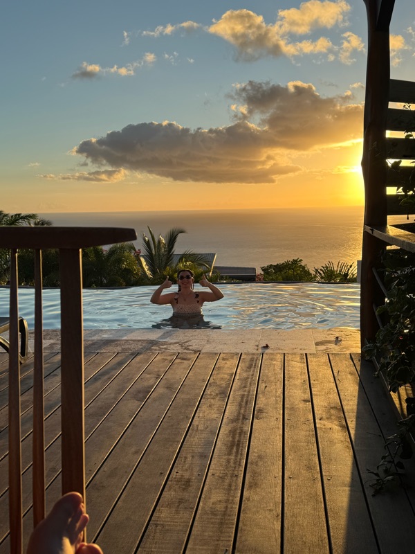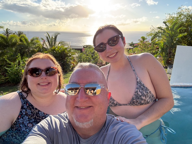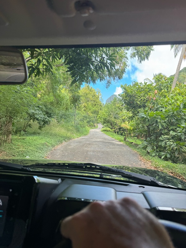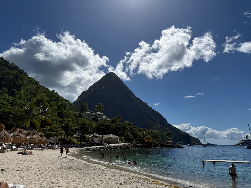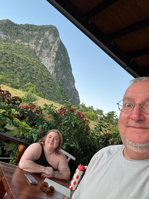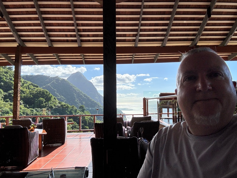 Beautiful. We were told that if you buy food or drink, just save the receipt and you can catch a shuttle up the steep road back to parking. Man, this can’t get any better… well, that’s closer to true than we thought at the time. The beach was really pretty and being sandwiched between the pitons, made it picture perfect. But instead of taking pics, we decide to enjoy first. So… palapa… don’t care how much, I want one. Find a free one and ask… ummm ‘no’, only for resort guests. Ok, fine. We lay out stuff out on the sand and get in the water. Wow, just beautiful. We enjoy a while, but I wanted a drink and maybe a snack while drying off so I could put on sunscreen, before getting back in the water. Bailley wanted a drink and Abigail didn’t want to be alone, so we all leave the water. Walk up to restaurant… ummm ‘no’, only resort guests. Huh… ok, so how do we get a drink or receipt. One non resort place next door.., ok. So we walk there, and they aren’t seating people… I guess it was between services. Hmmm, ok, so we decide to leave and maybe come back another day. We find the shuttle and just pay them to drive us up to the car. We drive and stop at Martha’s table (hand written menus, as legit as they come)… they stopped serving for the day. Hooo boy, striking out left and right. So we start heading back and tried a couple more places before finding one open and accepting us. Luckily, the food was good and the views, unexpectedly, were phenomenal. Which ended up being good, because we only got one or two pics on the Sugar beach.