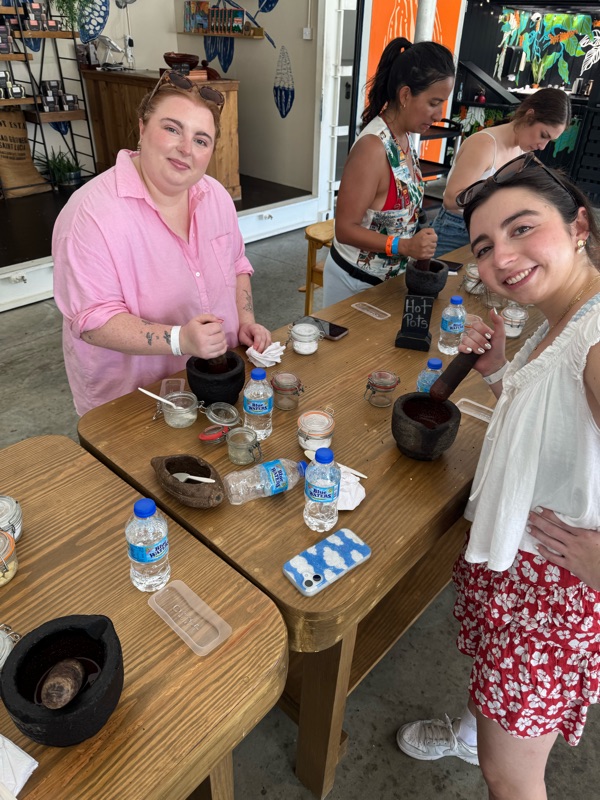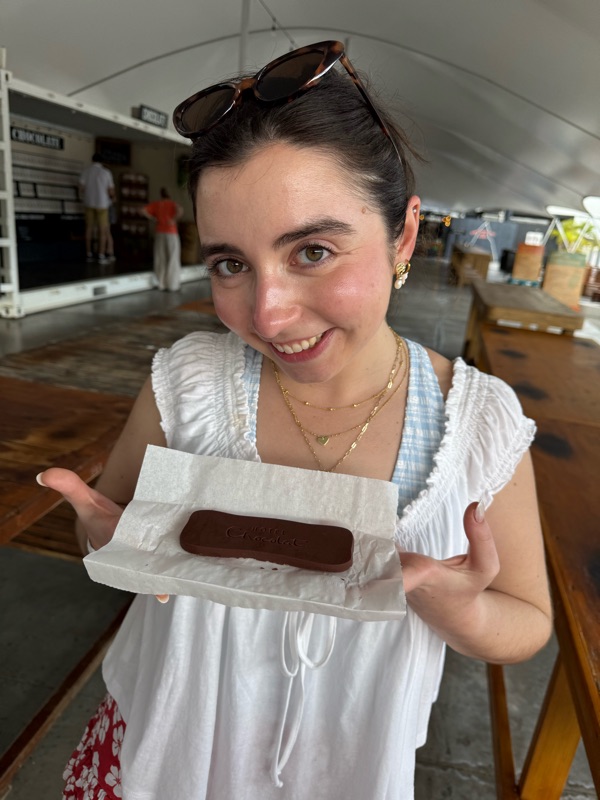 After the tour we got to make chocolate bars, like legit make. We used a hot mortar and a pestle to pound the cocoa nibs until it made a paste… maybe 20 minutes of continuous pounding. Then cocoa butter followed by slowly adding powdered sugar. Then 10 minutes of mixing before pouring it into a mold. They put the bars in a freezer while we ate lunch.